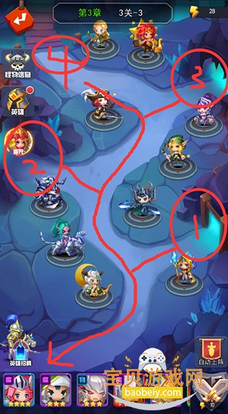 二、英雄组合搭配:1号口周围建议上高培养和带减速的英雄2号位置选择环型范围性英雄。3、4号位置为技能释放距离较远的为主。