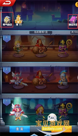 游戏中产出装备的主要产出非试炼之塔莫属,试炼之塔每层塔有3个boss,每个boss都有3种难度进行选择,打过对应难度boss可以获得相应的星星,星星可以在每一层打完之后选取buff。打败boss可以获得勇气币,同时每打5层可以获得一个宝箱,宝箱首次打开会出完整的装备,之后每天都有1次免费的重置试炼之塔的机会,重置之后玩家在开宝箱会获得随机的武器碎片。右上角是勇气商店,左上角则是可以观看已经获得的所有增益效果。