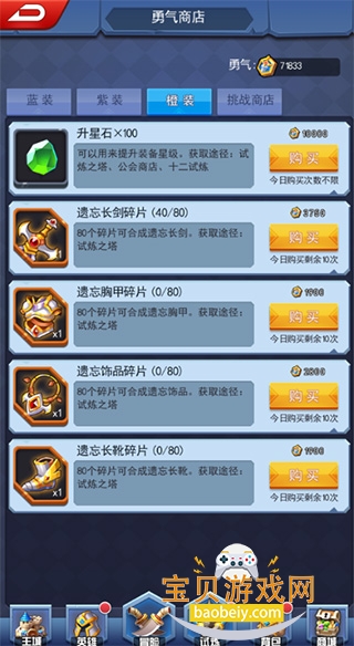 在试炼之塔中获得勇气币之后可以在勇气商店购买武器碎片和升星石。蓝装,紫装中购买装备碎片是没有次数限制的,只要你有勇气币你就可以无限买买买。橙装的装备碎片每个部位每天限购次数为10次。挑战商店是需要达到对应的层数才可以开启购买,每个装备仅能购买一次,但是这里所需消耗的勇气币同类装备要比其他商店都要低很多。