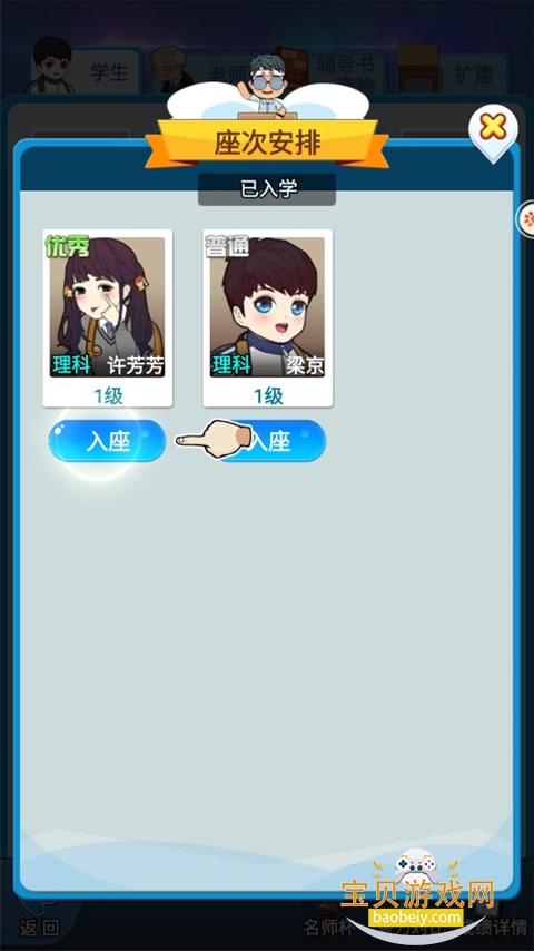 2.深度学子培养系统:学子分为学神、学霸、潜力生等不同资质,涵盖文科、理科、艺术等多元特长。通过“课堂授课”“课后辅导”提升成绩,“竞赛特训”强化专项能力,还能为学子搭配“错题本”“教辅资料”等学习道具,助力从潜力生逆袭为顶尖学神。