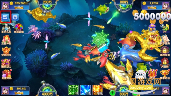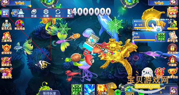 玩家可以点击左上角的四个口,打开“更多页面”,可以使用炮台切换、游戏设置、查看图鉴、切换捕鱼房间、离开房间五个功能。