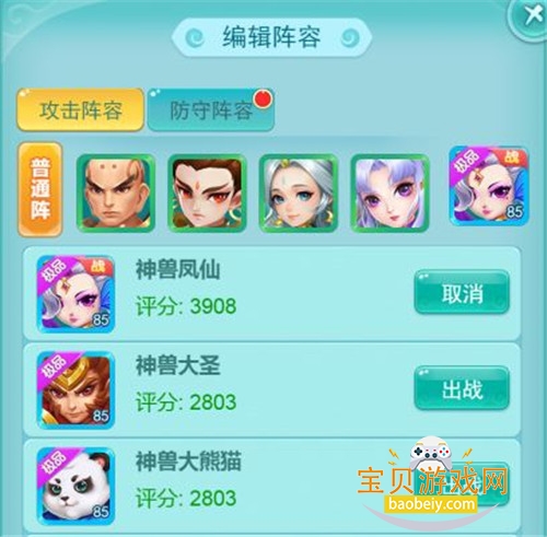 在此少侠可调整自己的攻击阵容,并配置好防守阵容以备应战;可选4名仙君、1名宠物和1个阵法。