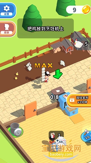 4、有了烹饪机和桌子,现在我们无抓些鸡,一次只能抓5只,抓好后我们把鸡放到烹饪机上。