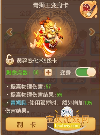 作为最契合内圈狮驼的大大王变身卡,仅变身卡的增益就能为狮搏技能提供57点物伤还15%的伤害结果,效果立竿见影。