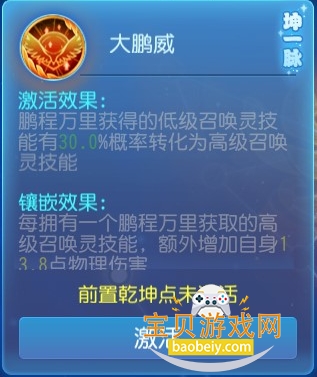 狮驼岭的坤一脉内容狮驼岭的小伙伴们或许并不陌生,除却加成了物理防御、速度和减免来自召唤灵的物理伤害结果外,新增的特性是鹏程万里击败敌方目标获得的低级宠物技能将有一定概率变为高级技能。