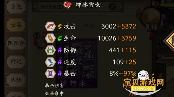 1、首先一起来看一下带涂佛的雪女的面板,可以看到她的攻击属于s级,防御速度和暴击也非常高,暴击伤害为178%,效果命中有7%。带涂佛的蝉冰雪女在出手后,自身可以获得两倍的涂佛加成,降低玉藻前的血量,配合酒吞的增加伤害,降低玉藻前的面板需求。