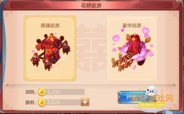 订婚以后便可以马上开启花轿巡游了,花轿巡游分为普通巡游和豪华巡游两种,普通巡游需要消费5200金币,豪华巡游需要消费131400金币。