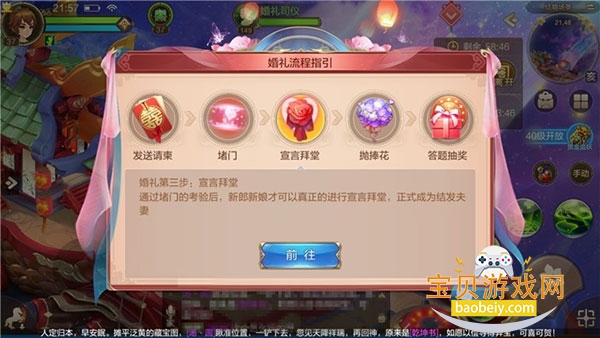 通过了堵门阶段之后,队长点击与NPC对话,选择宣誓拜堂,双方新人在心型两侧按手印,新郎新娘正式开始拜堂,走过绚烂的彩虹之桥,一对新人来到月老面前,完成三拜天地之后该阶段才算结束,这一阶段算是比较传统的中式婚礼风格。