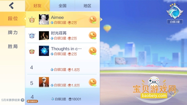 2、点击“段位榜”,弹出段位的排行页面,在页面上可见好友的段位排名和赠送游戏豆的图标。