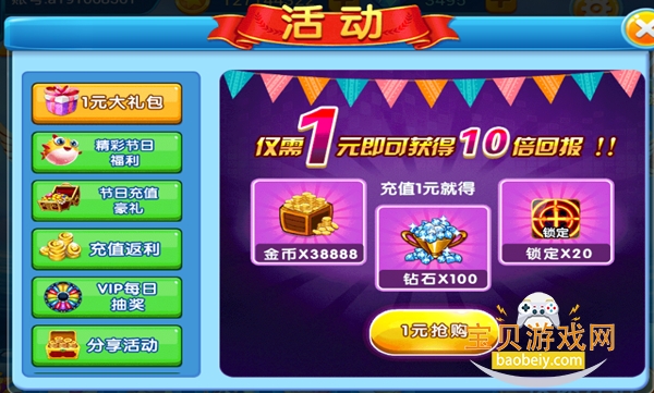 另外新版本还设有1元超值礼包,充值1块钱即可获得大礼包(38888金币+100钻石),详情点击主界面的【活动】-【1元大礼包】,活动多多,奖品多多,快来梦幻捕鱼开一局~