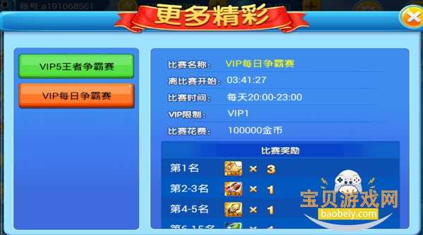 VIP5王者争霸赛:每天18:00~24:00可以参与,排名越靠前的玩家奖励越好。