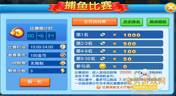 全民挑战赛:进入游戏后获得20000发炮弹,有限炮弹的情况下的分排名越靠前的玩家最终奖励越好。