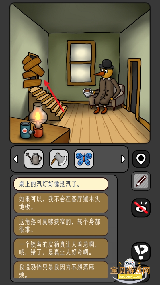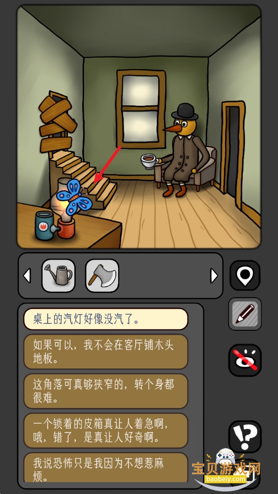 1、点击进入房子,进入二楼的房间,拾取地上的【水壶】。