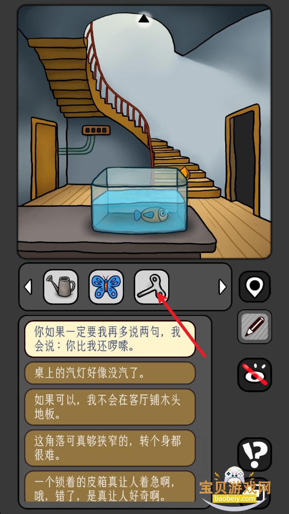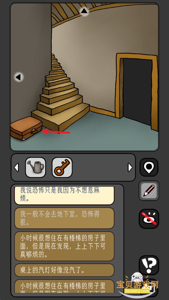 6、回到地下室,点击角落的行李箱,用【钥匙】打开,获得【斧头】和【汽油】。注意纸条上的箭头及纸张折角的位置:左上-下、右上-左、中-上、左下-左、右下-右。