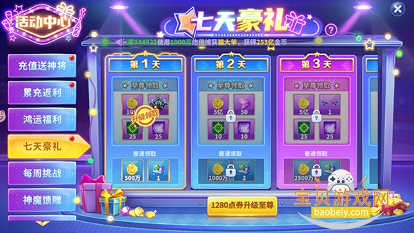 2、七天豪礼,每日签到领取海量道具礼包。