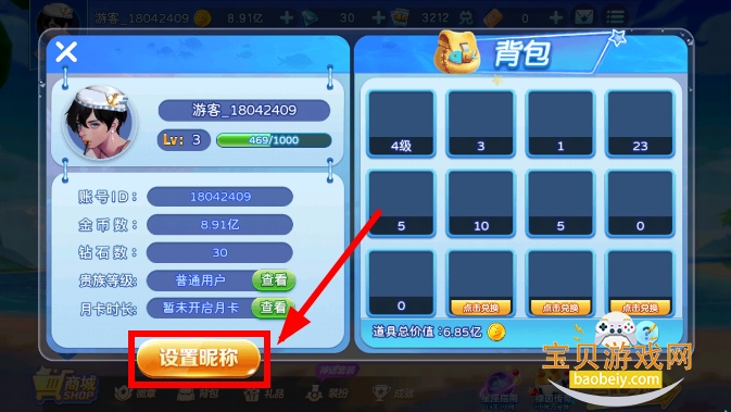 2、之后会进入背包界面,右侧下方有设置昵称的功能,点击设置。