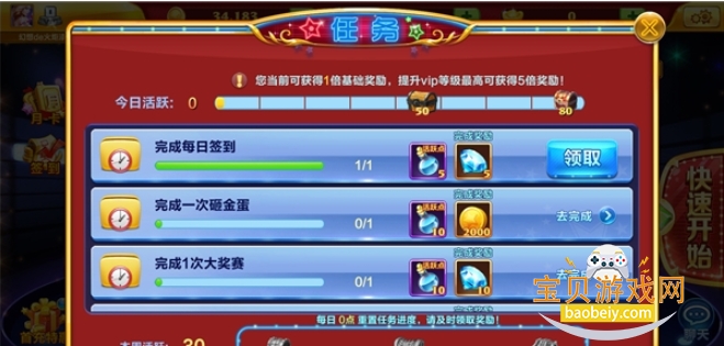 四:每日任务一定要完成啦,完成任务也是有钻石奖励的,虽然小,但苍蝇腿小也是肉啊,反正每天都会玩,按照任务去玩,还能拿钻石,何乐而不为呢?