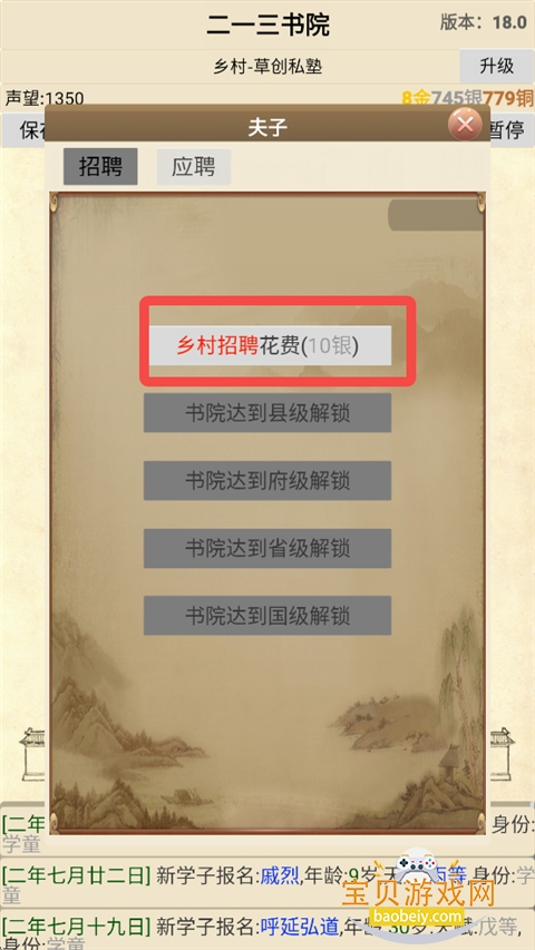 2、然后要进行招聘,在夫子招聘出,花费银子招聘夫子。