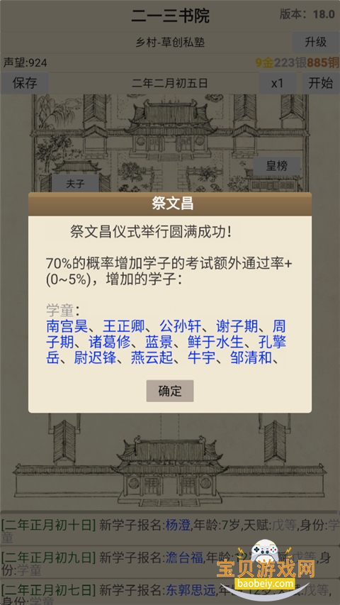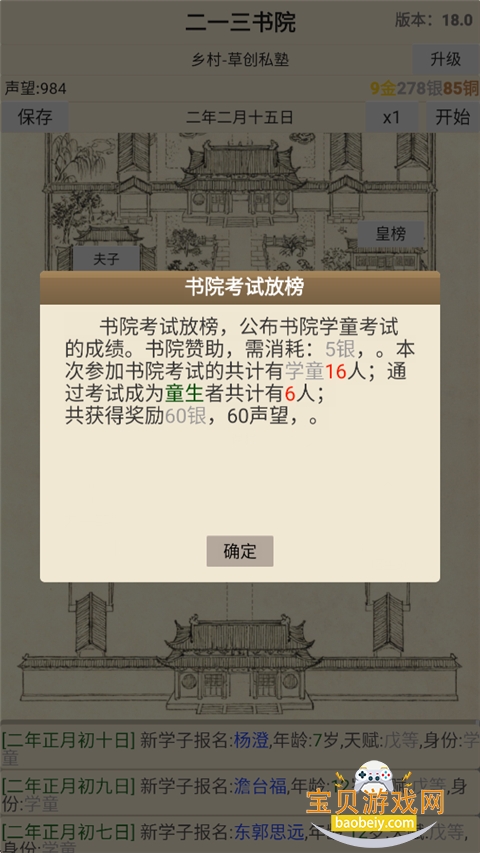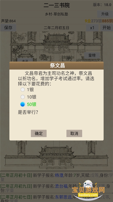 6、开始书院考试,需要耗费800铜。