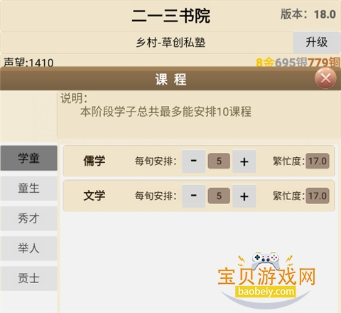 3、夫子招聘完毕,需要为学子们安排课程,童生阶段可安排10堂客。