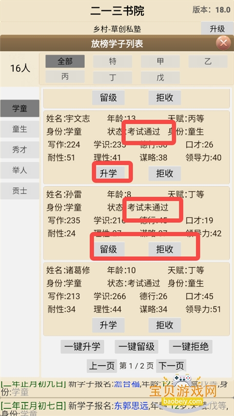 8、来到皇榜中,对于考试通过的学习可以进行升学,而对于为通过考试的学子可以留级也可以据收。