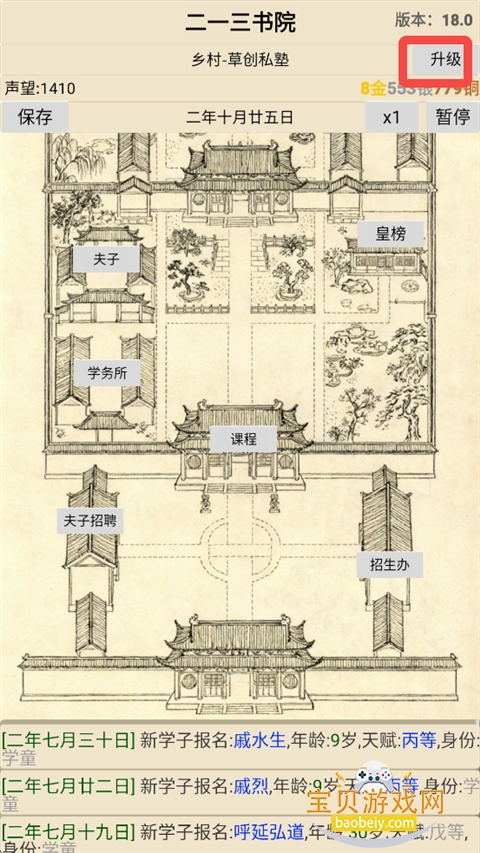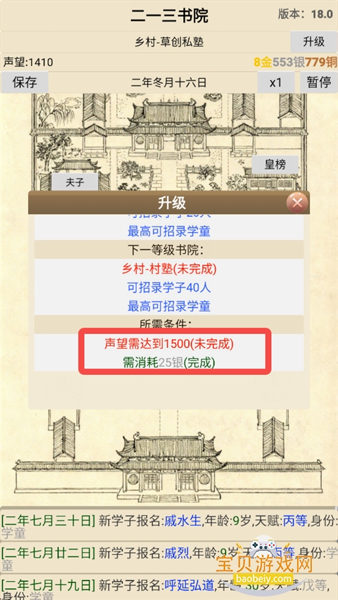 10、玩家可以查看升级到下一等级书院需要达到的条件。