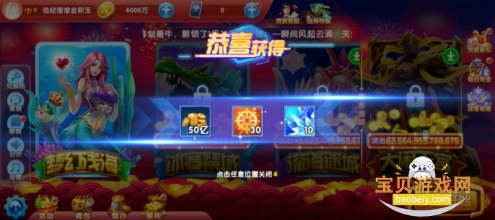 2、游戏中设有多种道具和炮台供玩家选择,玩家可以通过使用不同的道具来升级炮台的威力,从而捕获更多的鱼群。