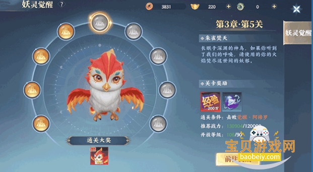 打不过或打不了就先去"妖境"打装备或者过主线提升等级再来,过完第一章你就有了第一只妖灵朱雀,记得把它放上阵!