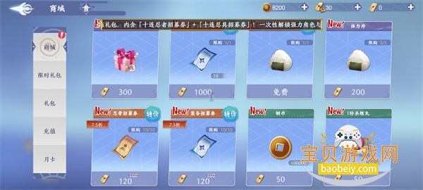 在商城购买忍者招募券、装备招募券等道具,获取强力角色和装备提升战力。