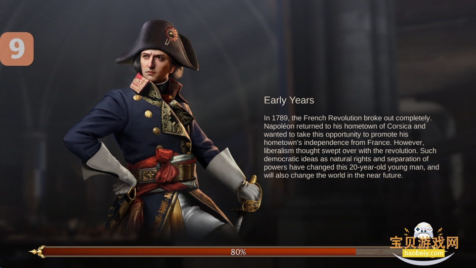 3、这里会交代游戏背景,1789年,法国大革命彻底爆发,拿破仑返回家乡科西嘉岛,并想趁此机会推动家乡从法国独立,但自由主义思想随着革命的热潮席卷而来。天赋人权、三权分立等民主思想改变了这个20岁的年轻人,而且在不久的将来,也将改变这个世界;