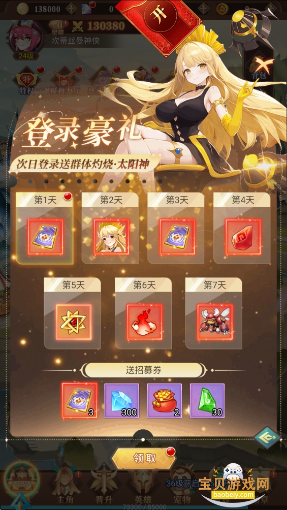1、登陆到暮光召唤师游戏后先游戏的世界界面先登陆登陆福利,再到福利大厅领取签到奖励,然后前往酒馆通过高级招募获得专属英雄