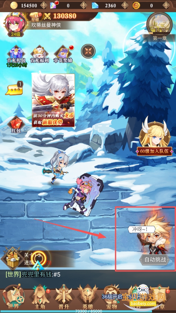 2、下面就是前往主线章节进行闯关挑战了,除了闯关可以提升等级之外,还可以通过挂机、日常活动来领取相应的升级经验奖励