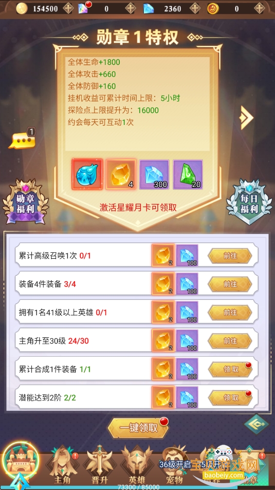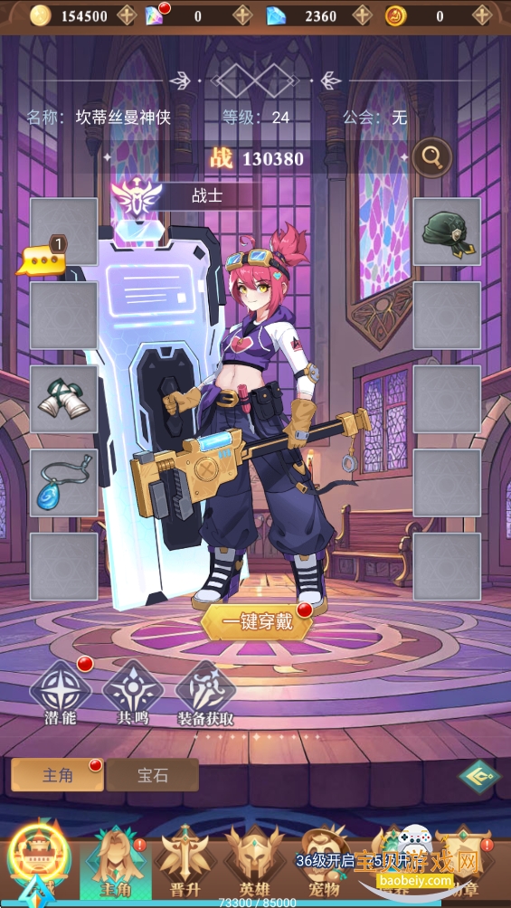 1、先对主角进行培养,一键穿戴装备,再对潜能进行升阶,达到80级后开启宝石镶嵌玩法