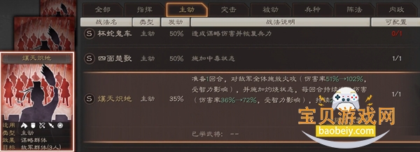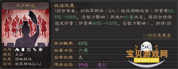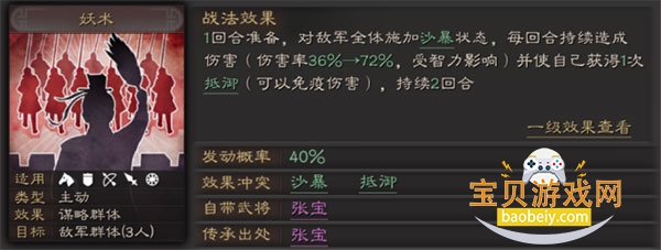 可靠的发动概率,快速生效的伤害,应该是伤害期望最高的A战法。首推。谋略系通用。不可与妖术等沙暴状态混用。