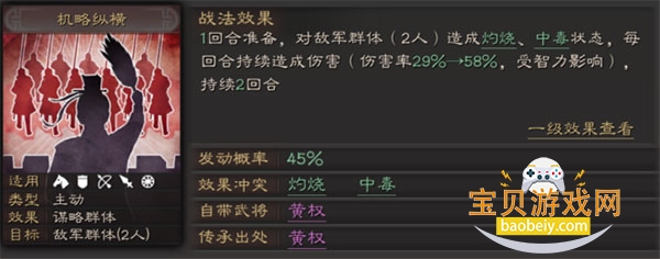 可靠的发动概率,持续型伤害,总伤害高,但生效慢。造成两种异常状态,可以配合其他战法。但来源武将黄权的可获得时机比较晚。