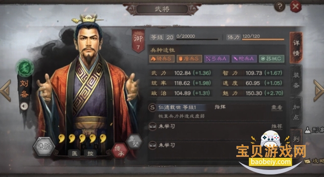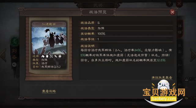 刘备作为蜀国的核心武将,很多强力阵容都有其一席之地,例如:蜀枪、桃园盾等等。因其自带战法“仁德载世”,具有回复自身兵力虚弱对手的效果,也被玩家们称为游戏第一“辅助”型武将。