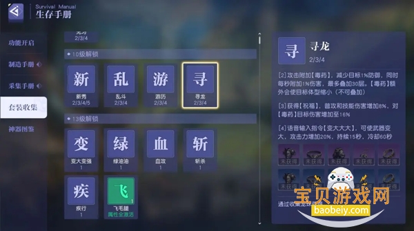 第一天推荐收集【寻龙套】,通过完成龙珠支线获得,而龙珠可以通过在地图中探索获得;寻龙套可以提供稳定的增伤,让自己变大敌人变小,墙裂推荐!除此之外,还有一些其他的小套装也推荐大家收集,例如乱斗套、绿油油套等,推荐大家在生存手册中进行查看,寻找自己心仪的装备