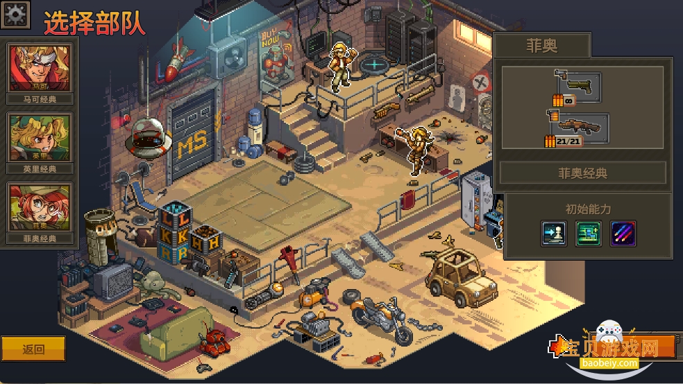 解锁并升级经典《合金弹头》角色。为他们配备独特技能和自定义装备。