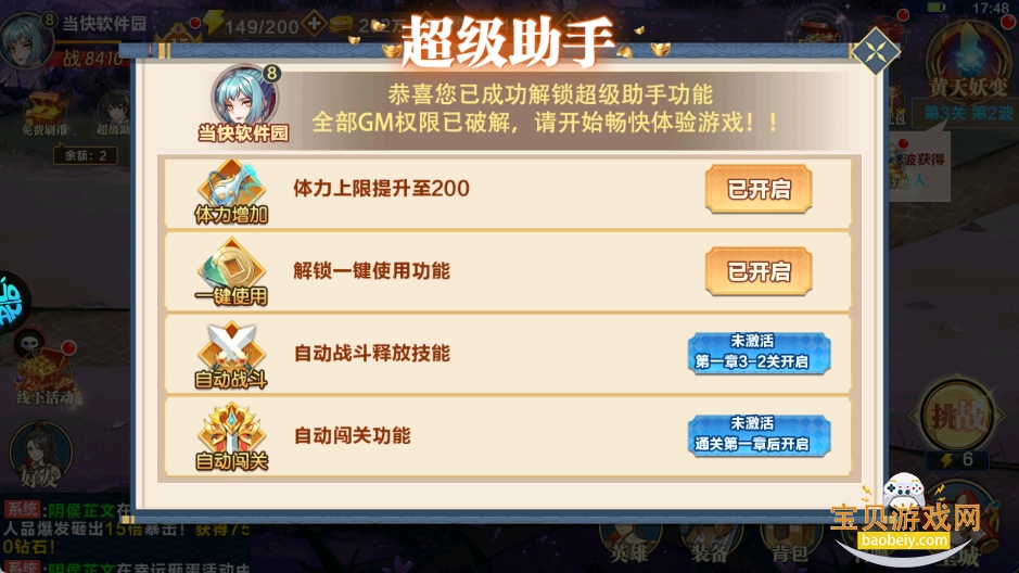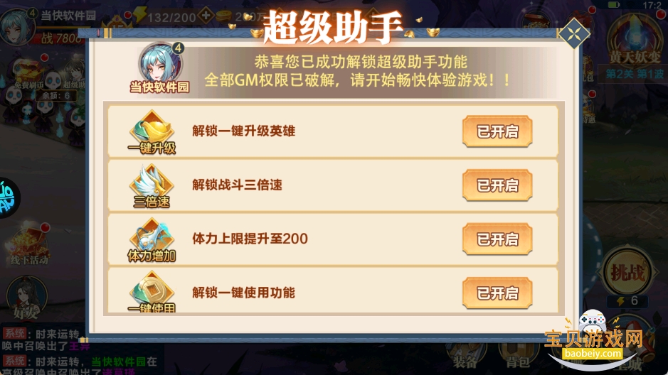 5、开启GM版“超级助手”,解锁游戏全部Gm权限,闯关会更加顺利。