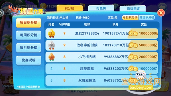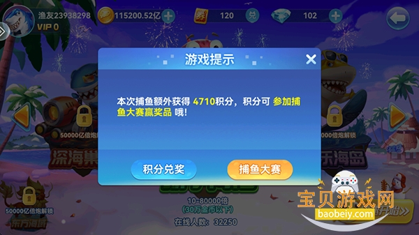 5、玩家可以随时退出,在渔场捕获可以获得积分,积分可以参加捕鱼大赛;