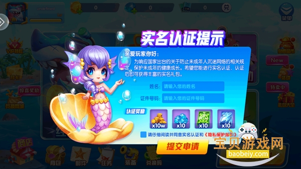 首次进入游戏需完成实名认证,认证后可领取包含金币、钻石等的实名礼包。