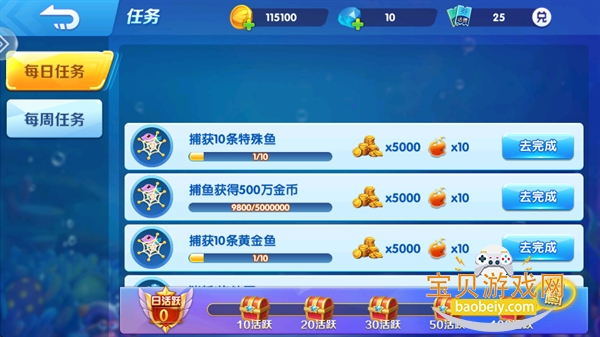 每日、每周有不同任务(如捕获特殊鱼、获得指定金币数等),完成可获取金币与道具,积累活跃度还能开启活跃宝箱。