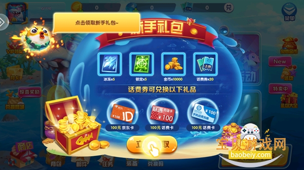 可领取包含冰冻道具、锁定道具、金币及话费券的礼包,话费券可兑换京东卡、话费卡等礼品。