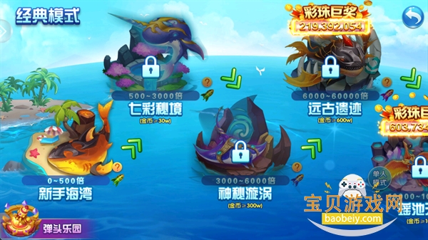 游戏设有多个捕鱼场景模式,需达到对应金币门槛(如 新手海湾”无门槛、七彩秘境”需30万金币等)才能解锁更高倍率场景。