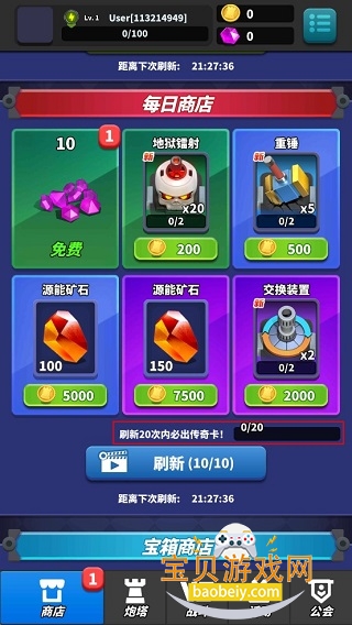 在每日商店中,可以每日看广告刷新最多10次商店,有机会在6号位置随机刷出传说炮塔或者传说英雄,刷新二十次必出传奇卡,只需要一千钻石哦。