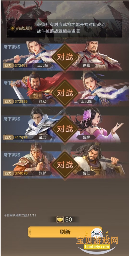 武将单挑,主要是产出武将信物与魂玉、魂币,其中完成挑战且获胜即可获得对应的武将部分信物,该玩法中,仅能挑战已拥有的武将,可通过刷新来重置刷新可挑战的武将,每个武将挑战成功后会解锁下一阶段该武将的难度,难度提高同时奖励也会随之增加。