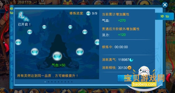 1、开启修仙系统后,仙友可以消耗一定真气与铜钱进行修炼;