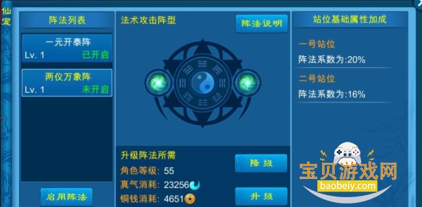值得一提是,位列阵法的副宠们,属性会自动叠加至角色身上,并根据阵法等级获得相应属性加成,而主宠则不能放入阵法当中。同阵不同宠,异宠搭配更能彰显实力。此外,花费铜钱和真气还能对阵法进行升级,进而增强副宠属性加成效果!