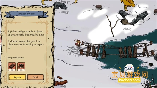 继续沿着叶子小径走,你就会到达断桥。你必须修好它才能找到另一边的阿姨。