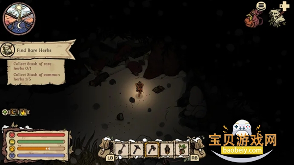 从头骨出发,穿过草丛向北,进入头骨所在位置上方的黑暗区域。装备Gnawtusk的灯笼,这样这里能更好地在黑暗中看东西。现在,在骷髅上方后,向北右走,直到找到另一个废弃背包。这里有两个常见的草药储藏点可以带走——这样总数就有三个。